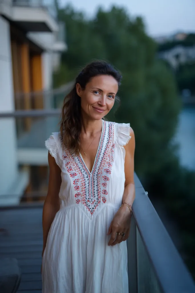 This look is all about embodying that beautiful, romantic bohemian spirit with a pop of patriotic color, perfect for a warm summer evening. The star is a breezy white midi or maxi dress, likely made of soft cotton or gauze, featuring a flattering elasticated empire waist and flowy silhouette. The deep V-neckline is beautifully decorated with detailed embroidery in shades of red and navy, which echoes the red ruffle peaking out at the bottom hem. It’s kept simple with minimal gold jewelry and a relaxed, sun-kissed beauty look.