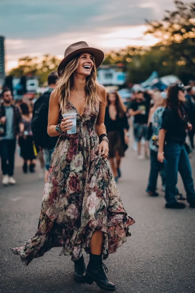 This outfit is the perfect mix of romantic and rugged. She’s wearing a flowing floral maxi dress with a deep neckline and soft, earthy tones that give it that dreamy boho feel. The fabric moves beautifully with every step, creating that effortless elegance that looks amazing in motion. Her wide-brimmed hat adds a chic Western touch, while the black combat boots give the whole look a cool, unexpected edge that makes it stand out from the crowd.