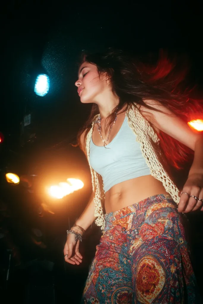 I love how this look feels so effortless yet totally intentional. The crochet vest gives it that handcrafted touch, while the patterned pants make it pop under the concert lights. It’s the kind of outfit that moves beautifully when you dance, looks stunning in photos, and somehow feels both comfortable and confident. It’s boho at its best—fun, free, and full of personality.