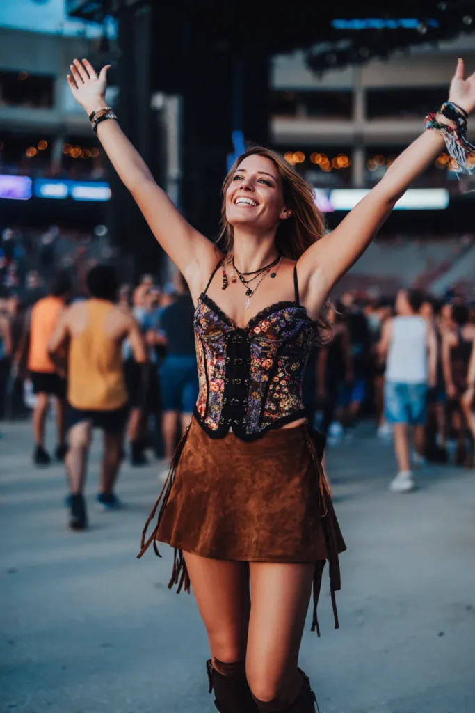 I love how this outfit balances structure and freedom. The corset gives her silhouette a confident, feminine edge, and the suede skirt keeps things relaxed and wearable for a concert night. It’s flirty without trying too hard, and the textures make it stand out under those warm stage lights. To me, it’s the kind of outfit that says you’re here to dance, look stunning, and have the best night ever.