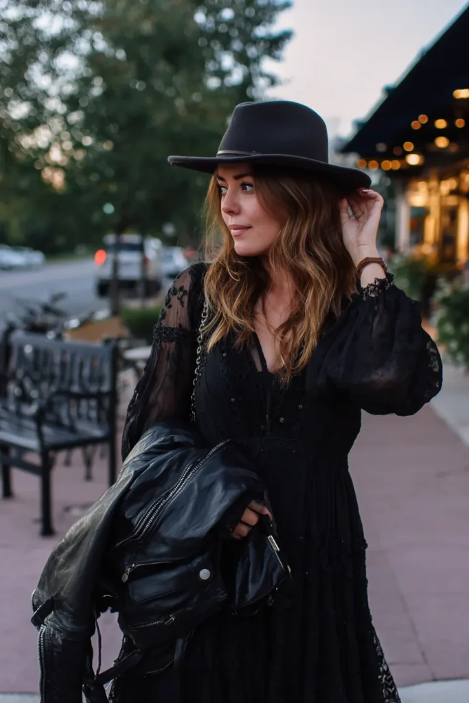I absolutely love how this look balances feminine and bold energy. The black-on-black combination feels timeless and flattering on everyone, while the hat and leather jacket give it that rock-boho edge that works perfectly for concert nights. It’s the kind of outfit that makes you feel confident, mysterious, and a little untouchable in the best way possible.