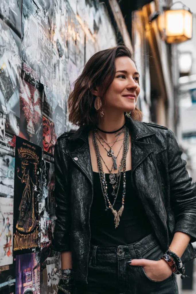 This outfit takes boho style and gives it a rocker twist. She’s wearing a classic black leather jacket with a slightly worn-in texture that looks perfectly lived-in, paired with a simple black top and dark high-waisted jeans. The real statement comes from her layers of necklaces—silver, beaded, and charm-filled pieces that add personality and a touch of rebellion. Her short tousled hair and effortless confidence complete that cool-girl vibe that feels right at home at any concert.