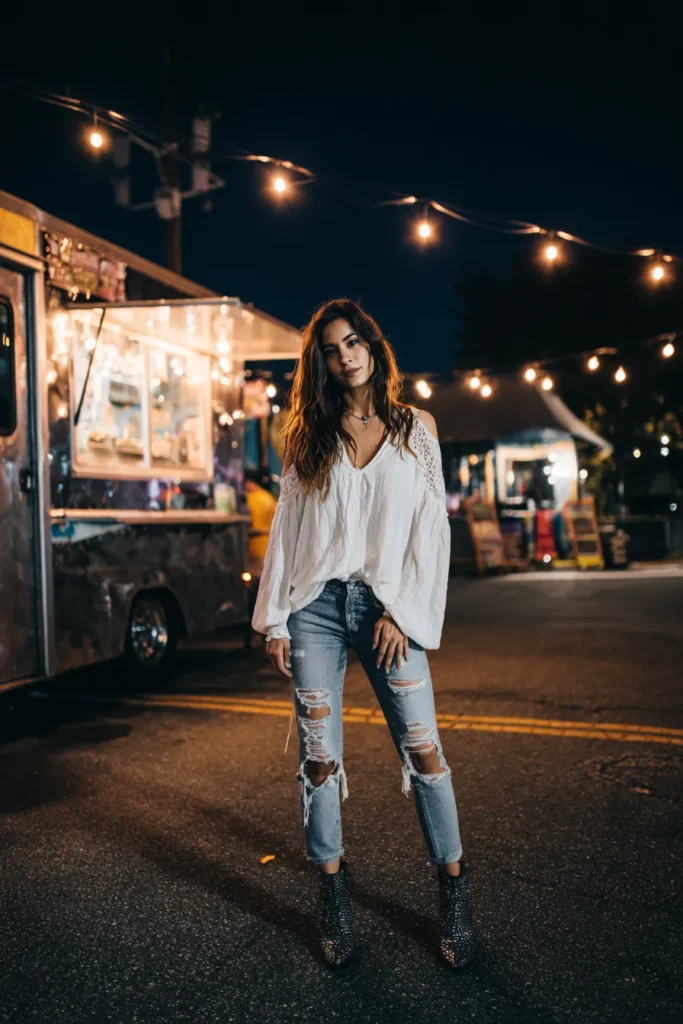This outfit captures that carefree, glowing-after-dark concert vibe perfectly. She’s wearing a flowy white off-shoulder blouse with crochet detailing along the sleeves that gives it a soft, romantic feel. The top pairs effortlessly with light-wash ripped jeans that add a hint of edge, while her sparkly ankle boots catch the light beautifully under the string lights above. The mix of relaxed and polished textures makes this look feel both effortless and eye-catching.
