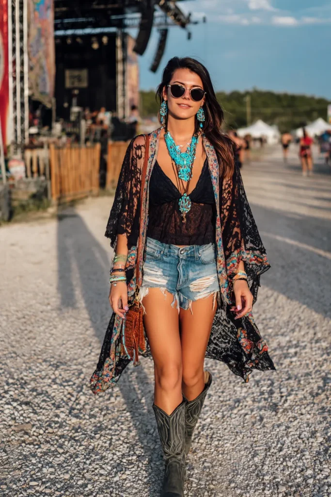 This outfit nails that carefree festival energy that every concert night needs. She’s wearing a sheer black lace kimono layered over a lacy bralette, paired with high-waisted distressed denim shorts that give it that perfect mix of soft and rugged. The turquoise statement jewelry steals the show, adding a gorgeous pop of color against the dark fabrics. Her round sunglasses, cowboy boots, and small crossbody bag complete the look with pure boho confidence.