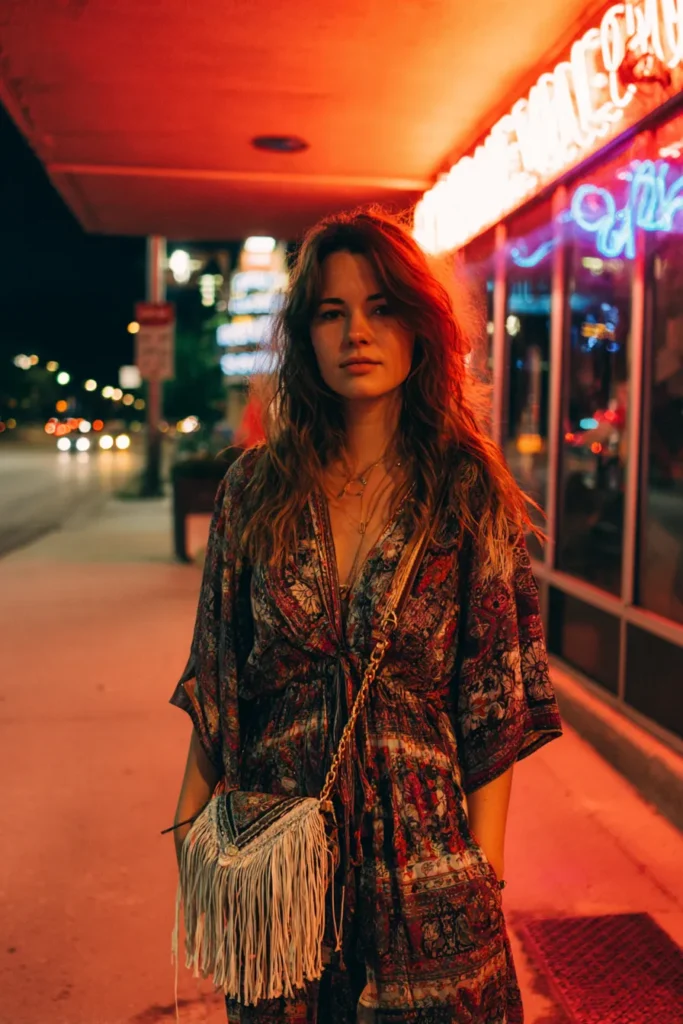 This outfit feels like the definition of laid-back boho charm. She’s wearing a flowing patterned maxi dress in warm earthy tones with a mix of floral and geometric prints. The fabric drapes effortlessly, cinched slightly at the waist to give it that relaxed yet flattering shape. Her textured crossbody bag with long fringe detailing adds a fun, free-spirited touch, while her tousled waves and layered gold necklaces complete the look under the soft neon glow of the city lights.