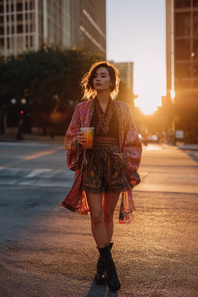 This outfit is a boho dream come to life. She’s wearing a silky printed kimono in shades of pink and gold layered over a matching patterned shorts set with rich earthy tones and ornate detailing. The flowy fabrics catch the sunlight beautifully, and the cinched waist gives just the right shape without losing that relaxed vibe. The look is finished with black lace-up boots that add a bit of edge, making it feel effortlessly cool and concert-ready.