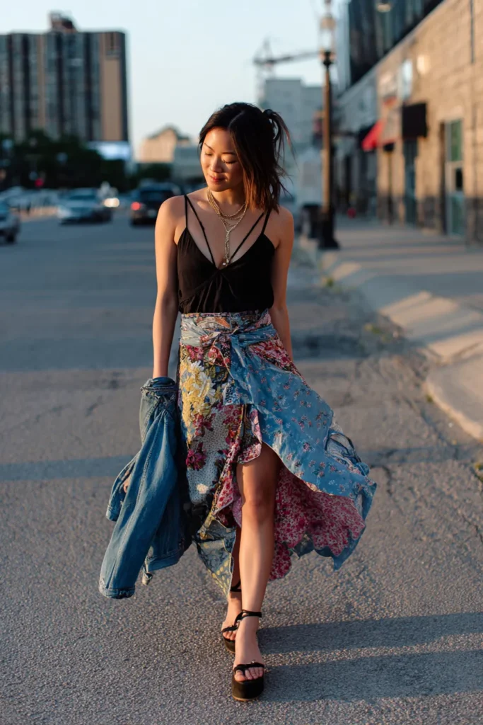 This outfit feels like sunshine and good vibes wrapped into one. She’s wearing a black strappy top with delicate gold necklaces that glimmer in the evening light. The star of the look is her flowy patchwork maxi skirt filled with floral patterns and soft pastel blues, pinks, and yellows that move beautifully with every step. A denim jacket casually draped in her hand and a pair of platform sandals finish the look, giving it that effortless, festival-ready feel.