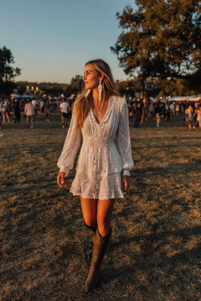 This outfit is the perfect example of soft meets strong. She’s wearing a white lace mini dress with long sheer sleeves and a flowy layered skirt that catches the light beautifully. The fitted waist and v-neckline give it a flattering, feminine shape, while the dark cowboy boots bring in that classic boho contrast. The look is finished with statement earrings and delicate layered necklaces that sparkle just enough in the golden hour sun.