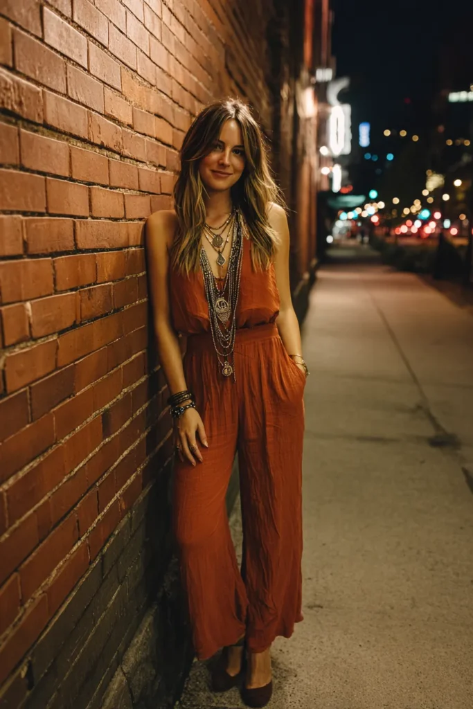 This outfit brings warm, earthy energy that feels made for late-night concerts and city lights. She’s wearing a rust-colored jumpsuit with a relaxed fit and flowy wide legs that make it look effortlessly cool. The lightweight fabric drapes beautifully, giving it that boho touch of comfort and ease. The look is elevated with layers of long necklaces, stacked bracelets, and natural waves that complete the laid-back vibe.