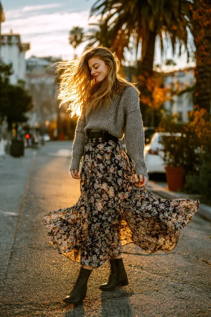 This outfit is the definition of laid-back boho chic. She’s wearing a flowing floral maxi skirt with warm earthy tones, paired with a chunky gray knit sweater that’s tucked in just enough to show off her waist. The look is finished with ankle boots and loose, wavy hair that catches the golden light perfectly. The combination of textures—soft knit and airy fabric—creates that effortless contrast that makes boho style feel so inviting.