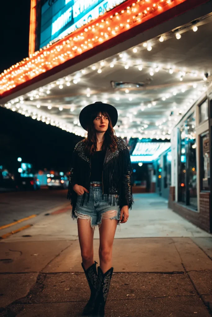 This look is the perfect mix of edgy and boho with a strong concert-night attitude. She’s wearing a black fringe leather jacket with studded detailing, a simple black tank top, and distressed high-waisted denim shorts. The outfit comes together with tall embroidered cowboy boots and a wide-brimmed black hat that adds the perfect final touch. The warm lights reflecting off her jacket make it shimmer just enough to stand out without trying too hard.