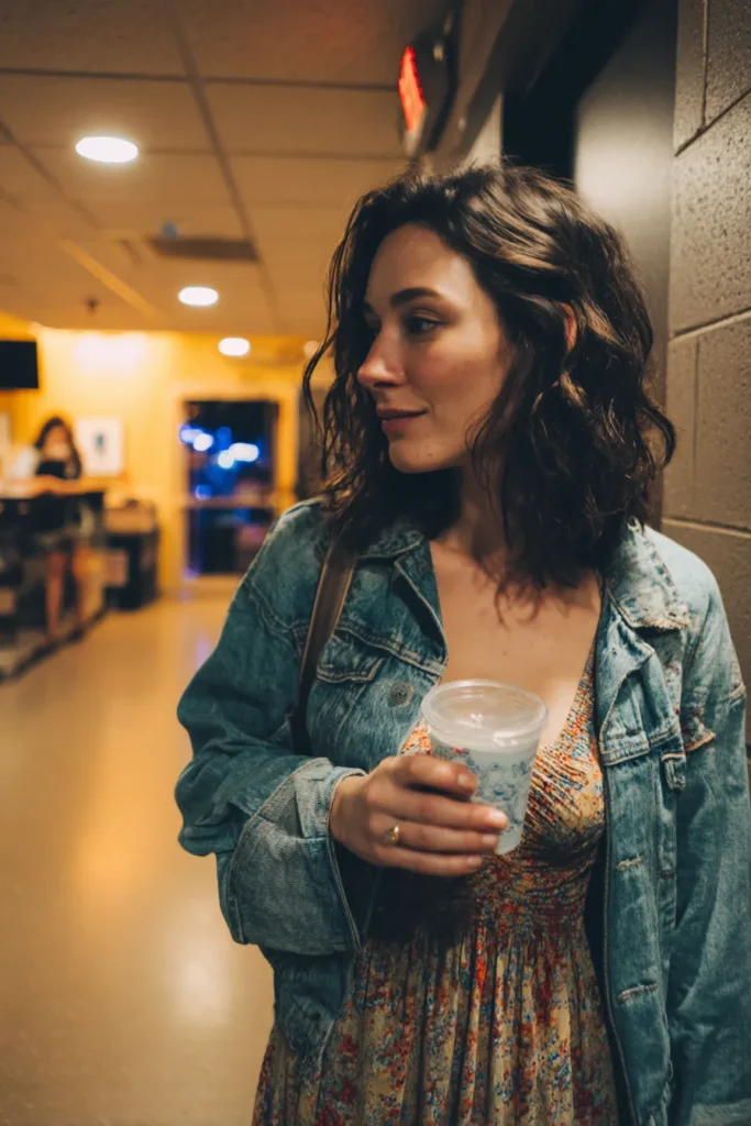 This outfit captures that effortlessly cool, laid-back boho vibe that feels perfect for a concert night. She’s wearing a flowy floral dress with warm, earthy tones that give off a soft vintage charm. The light denim jacket adds a casual touch and keeps things cozy for cooler indoor venues or breezy outdoor shows. Her tousled curls and minimal accessories make the whole look feel natural and carefree.