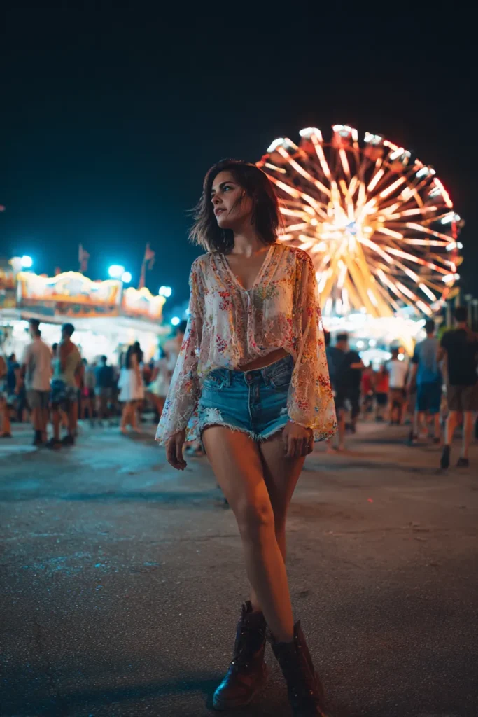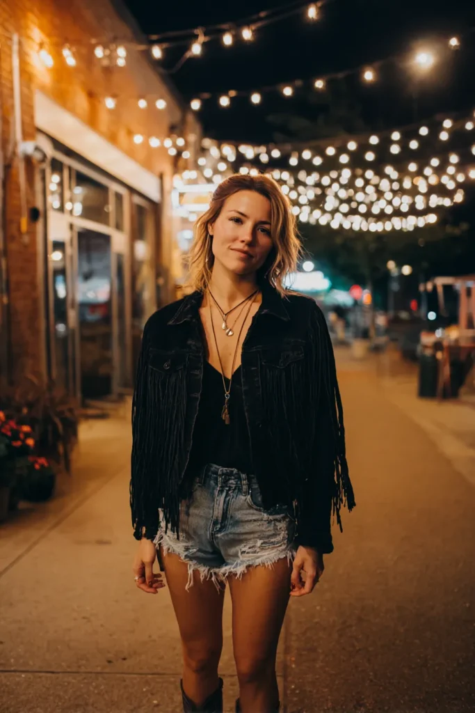 I love this outfit because it’s equal parts casual and confident. The fringe jacket steals the spotlight without feeling over the top, and those denim shorts are the ultimate festival staple. It’s the kind of outfit that looks like you didn’t try too hard, but still manages to turn heads every time you walk by.