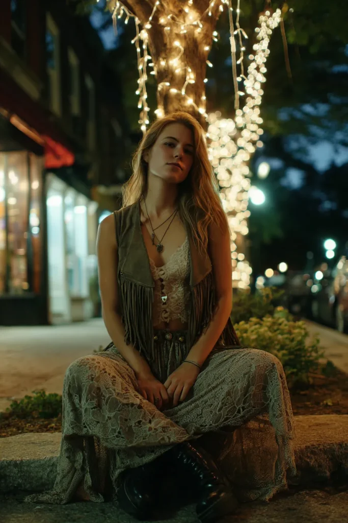 This outfit is the perfect blend of soft and rugged boho charm. She’s wearing a long lace maxi dress in muted beige tones, paired with a cropped suede vest trimmed in fringe. The combination of delicate lace and earthy suede creates that irresistible bohemian balance between feminine and free-spirited. Her long, loose hair and layered necklaces add even more texture, while the black combat boots keep it grounded and just a little edgy.