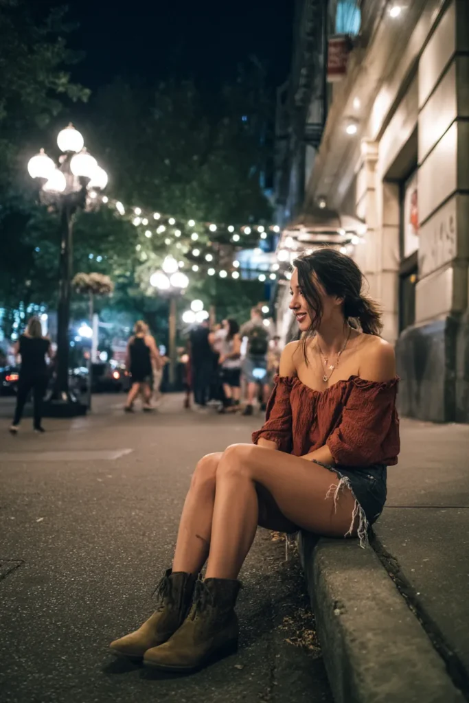 I adore this outfit because it feels natural and confident without trying too hard. The off-shoulder neckline is such a flattering choice, showing just enough skin to feel feminine while still keeping things relaxed. It’s the kind of look that lets you wander, laugh, and dance through the night lights while still feeling completely yourself.