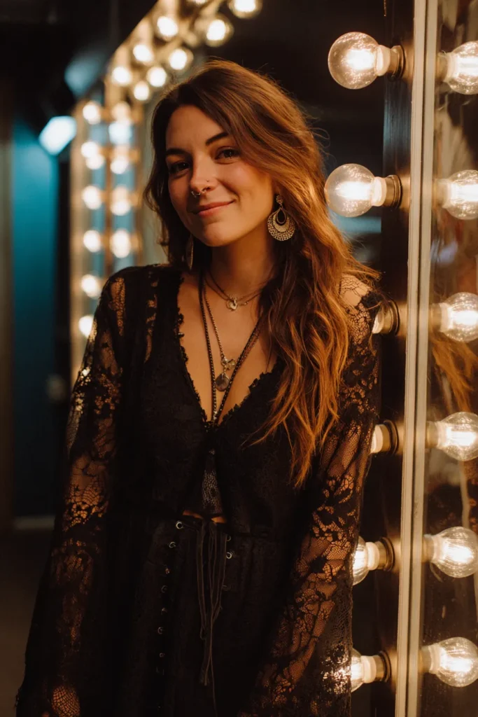 I’m obsessed with how effortlessly beautiful this outfit feels. The lace adds just the right amount of drama without being too much, and the jewelry gives it a grounded, earthy touch. It’s that mix of edgy and feminine that always wins me over, especially for a concert night where you want to look put together but still feel completely free.