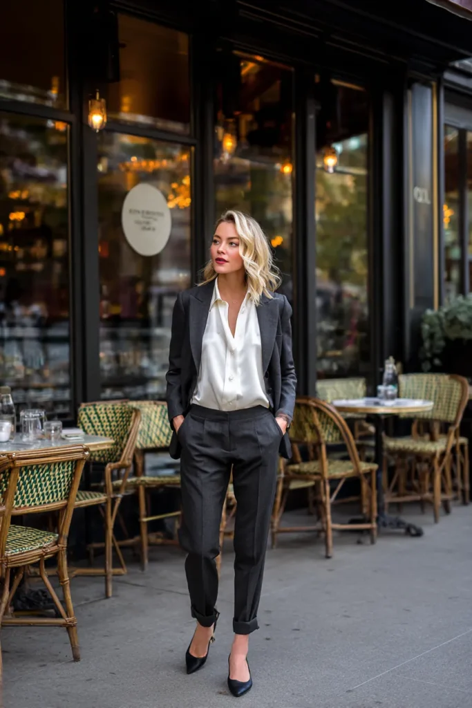 This outfit blends a tailored charcoal blazer with matching trousers for a sleek and structured base that feels instantly professional. The silky white blouse softens the look with a bit of shine and drape which creates such a pretty contrast against the darker fabric. Rolled cuffs on the trousers add a relaxed touch and the pointed black heels pull everything together with clean simple lines. The overall vibe is classic modern and effortlessly sophisticated.