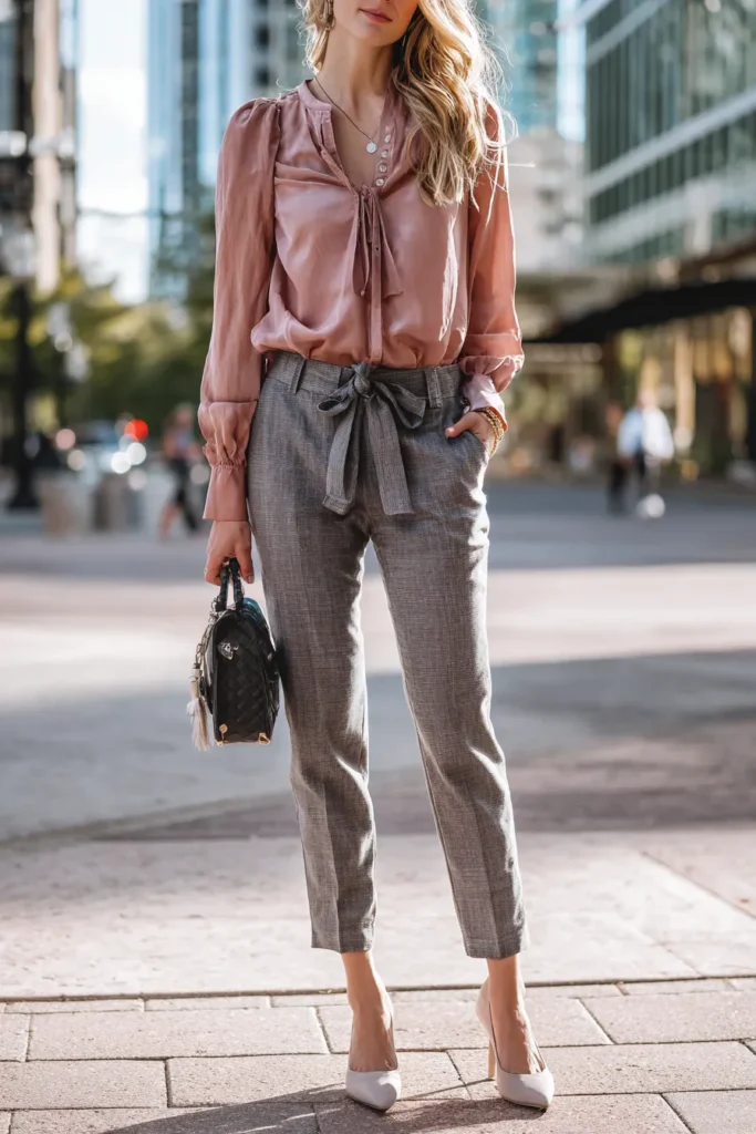 This outfit pairs a silky blush pink blouse with gentle sheen and gathered sleeves with a pair of gray tailored trousers that feature a flattering tie waist. The mix of soft fabric on top and structured fabric on the bottom creates such a polished balance. The look is finished with pale pointed heels and a small black textured handbag that pulls everything together with a touch of sophistication. The whole vibe feels feminine and office ready without feeling stiff.