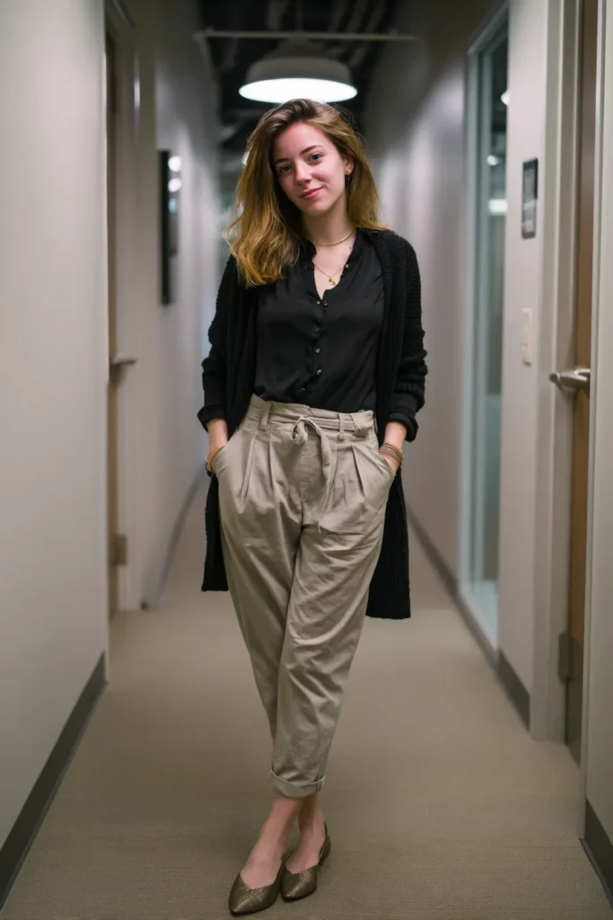 This look blends a buttoned black blouse with a long textured cardigan that adds a cozy layer without making the outfit feel heavy. The soft beige paperbag trousers give everything a relaxed structure and the rolled cuffs make the whole outfit feel intentionally effortless. Paired with simple metallic flats and delicate jewelry, the vibe lands somewhere between comfy and polished which is always such a sweet spot for busy workdays.