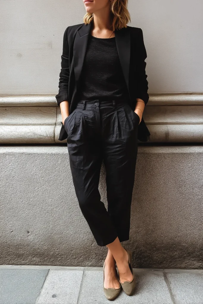 This outfit leans into a monochrome black palette with a fitted blazer layered over a soft knit top and paired with pleated ankle length trousers that have a touch of relaxed structure. The fabrics all have a subtle texture which keeps the look from feeling flat and the tapered silhouette makes the whole outfit feel sleek. The muted taupe flats add a gentle contrast without taking attention away from the clean all black base.
