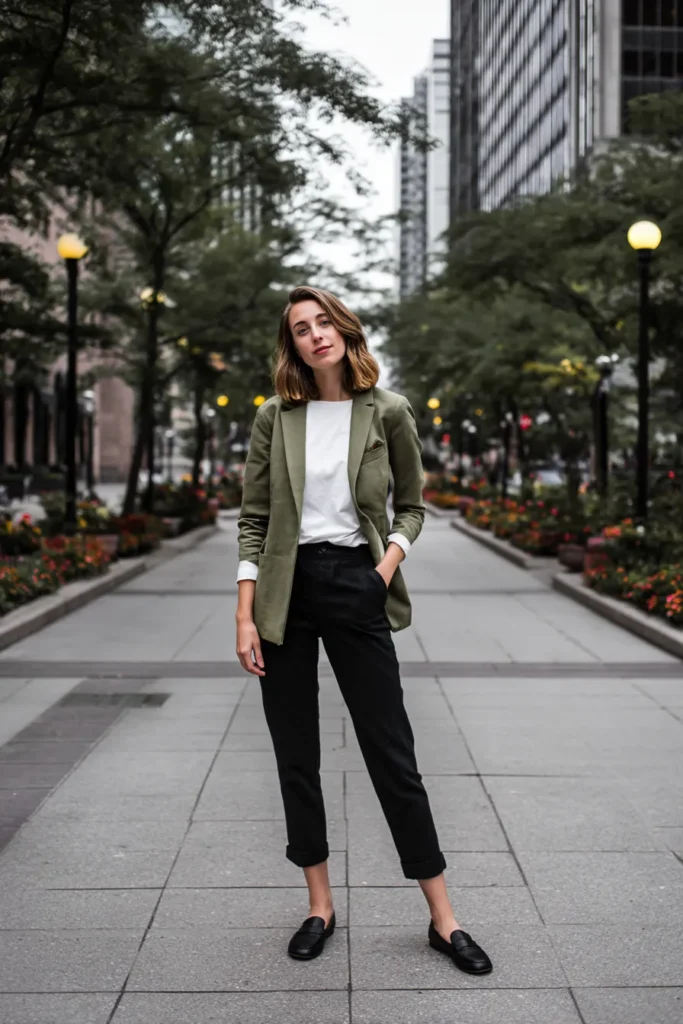 This outfit blends a crisp white tee with an olive green blazer that adds just the right amount of structure without feeling too formal. The tapered black trousers keep the silhouette sharp and the rolled cuffs give the whole look an easygoing edge. Finished with classic black loafers the vibe feels polished yet relaxed in that perfect city chic way.