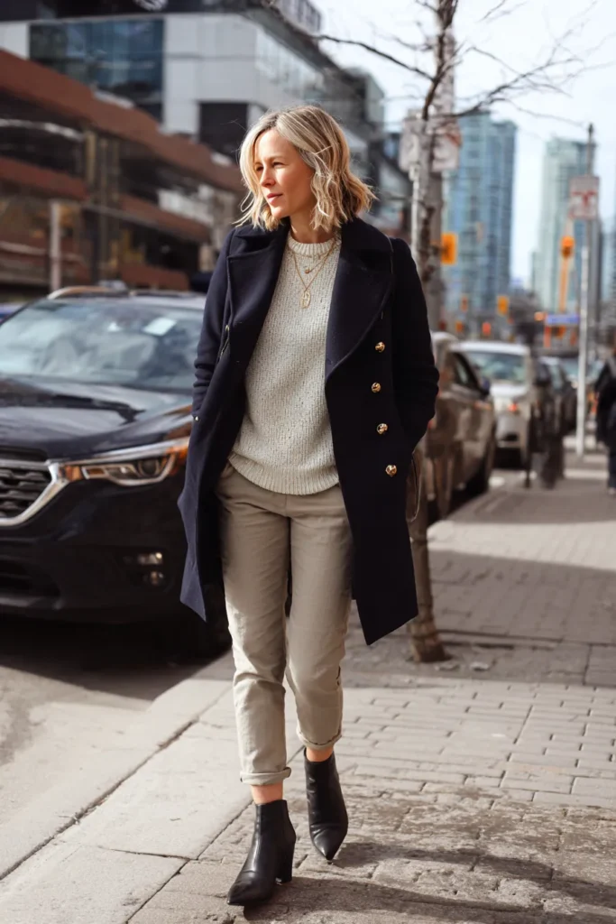 This outfit pairs a long navy coat with shiny gold buttons over a softly textured cream sweater that feels warm and relaxed. The light beige trousers keep things fresh and airy while the rolled cuffs add a casual touch that still looks polished. Black ankle boots finish the outfit with a sleek shape that ties in beautifully with the deep navy coat. The whole look feels classic approachable and perfect for chilly days in the city.