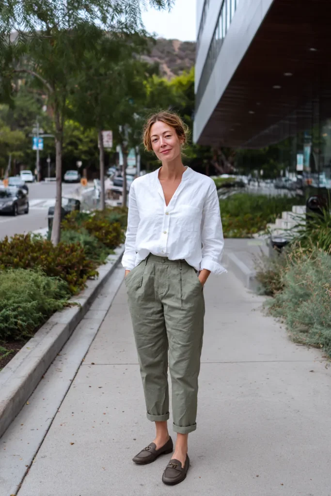 I love outfits like this because they make getting dressed feel so simple. The linen shirt keeps things airy and comfortable and the muted green trousers add that little touch of color without being bold. This is the kind of business casual combo I reach for when I want to feel put together but still totally at ease since it looks intentional yet relaxed at the same time.