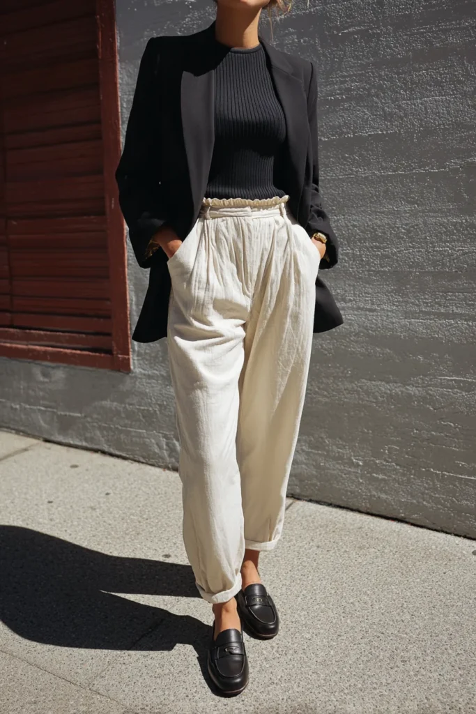 This look mixes a fitted black ribbed top with airy cream paperbag trousers that bring such a breezy polished vibe. The high gathered waist adds soft structure and the relaxed legs keep the outfit feeling effortless. A sleek black blazer sharpens everything instantly and the black loafers tie the whole palette together. The contrast of deep black and light neutrals feels modern clean and incredibly chic.
