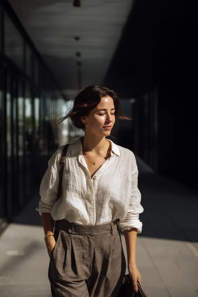 This outfit pairs a relaxed white button up with high waisted brown trousers that have a gentle pleated shape and a textured tailored feel. The linen like shirt drapes beautifully and adds that effortless undone charm while the trousers keep the look grounded and polished. The warm sunlight on the fabric makes the whole outfit feel calm and airy with a touch of quiet elegance. Simple gold jewelry finishes everything in a subtle way that never competes with the look.