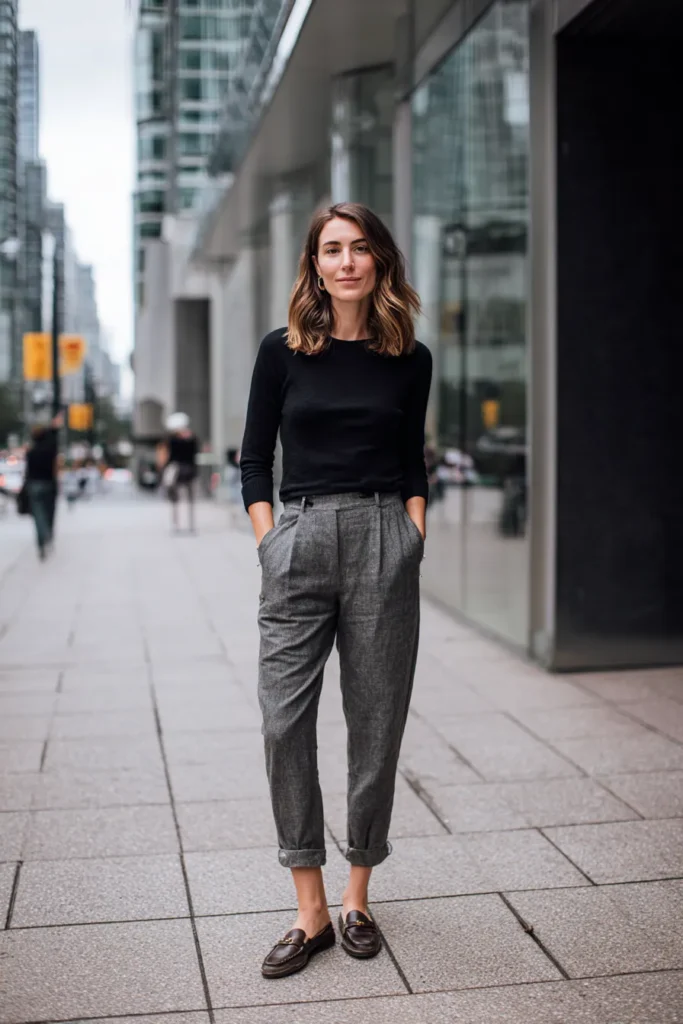 This outfit pairs a fitted black knit top with tailored gray trousers that have a soft pleated shape and a slightly relaxed fit. The rolled cuffs give the trousers a modern touch and the rich brown loafers add a bit of warmth to the cool gray and black palette. The overall mood feels clean simple and effortlessly polished with just enough structure to make it perfect for busy city days.