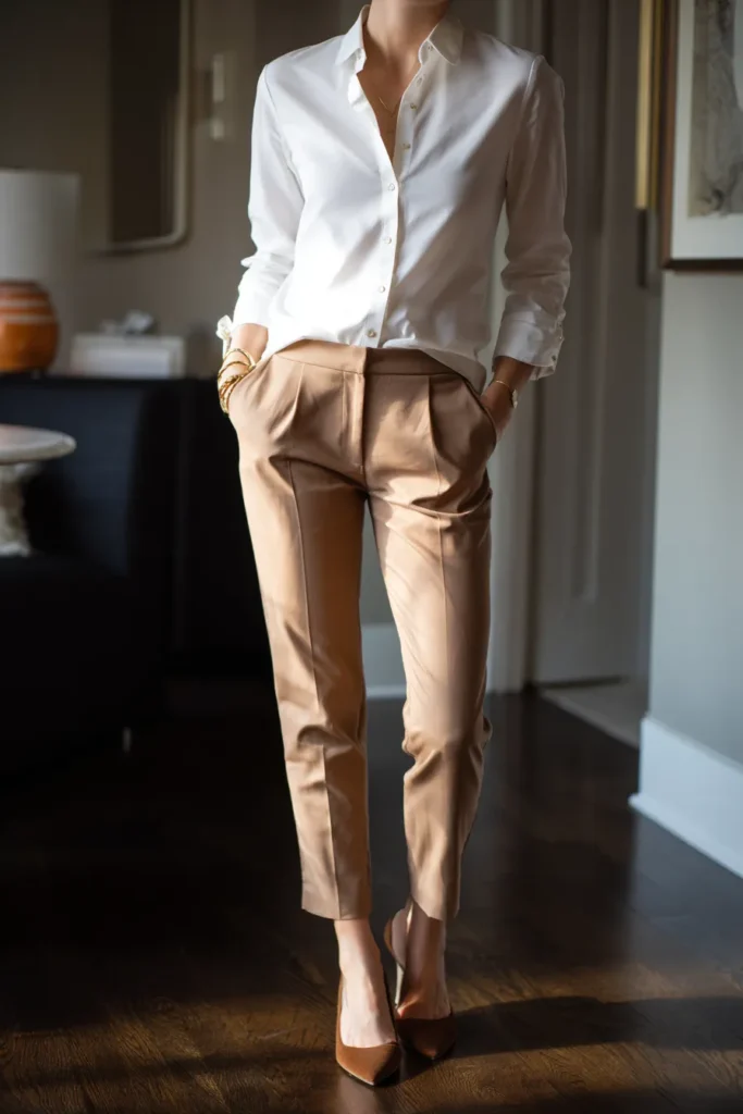 I love this outfit because it instantly makes me feel put together without any effort at all. The white shirt brings that fresh crisp energy I always want on workdays and the camel trousers soften everything with such an elegant tone. It is the kind of business casual look I reach for when I want something classy comfortable and endlessly reliable.