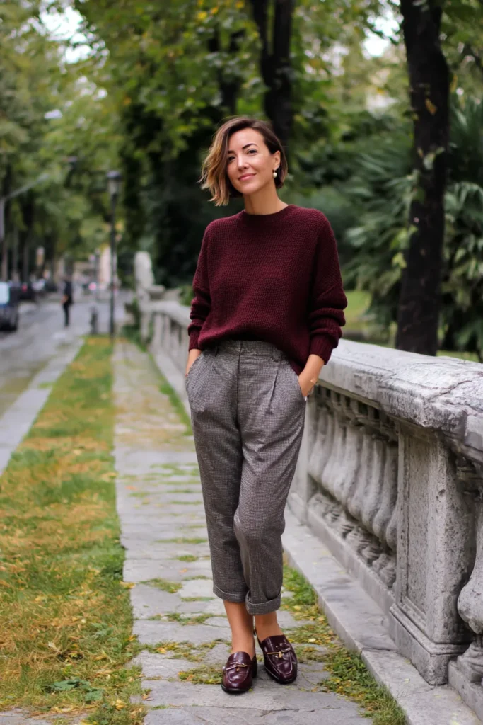 This outfit pairs a rich burgundy knit sweater with softly tailored gray trousers for a look that feels warm cozy and still polished enough for the office. The sweater has a textured weave that adds depth while the trousers bring structure with their pleats and tapered shape. Rolled cuffs and matching burgundy loafers complete the outfit with a subtle tonal harmony that looks effortless and refined. The whole vibe feels autumn inspired classic and perfect for a workday that leans relaxed.