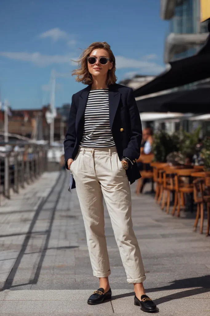 This outfit blends a navy blazer with polished gold buttons over a classic black and white striped top for that timeless Parisian inspired vibe. The relaxed cream trousers keep things light and easy while the rolled cuffs add a casual touch that still feels intentional. Black loafers with gold hardware tie back to the blazer and bring the whole look together in a clean balanced way. The entire outfit feels fresh crisp and perfect for a day spent between meetings and errands.