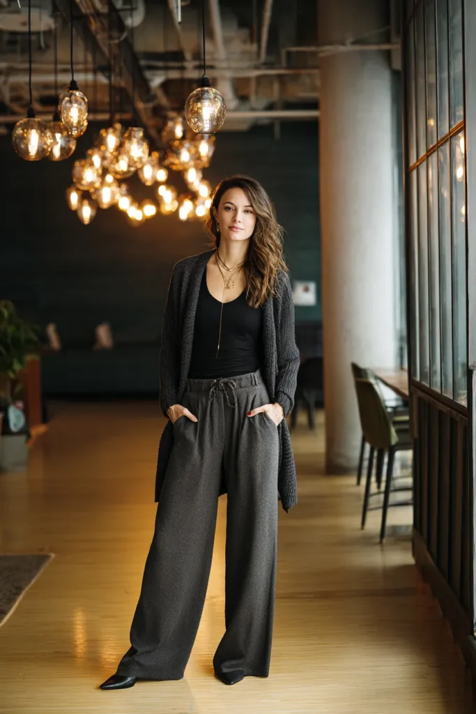 I love how this combo feels effortlessly chic. The wide leg trousers make me feel tall and confident and the cardigan adds that cozy wrapped up feeling I can never resist on busy mornings. The monochrome palette keeps everything sleek which always makes me feel more put together. This is one of those business casual outfits I reach for when I want something comfortable elevated and just a touch dramatic in the best possible way.