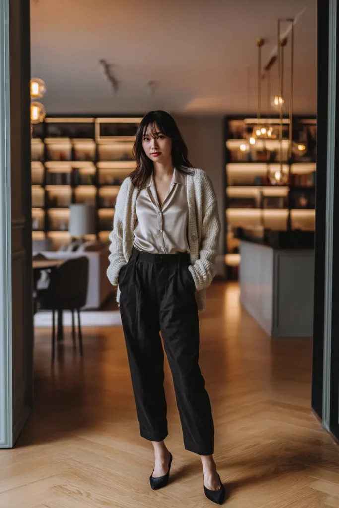 I love how this outfit feels like a secret weapon on mornings when I want to look put together but also want to stay wrapped in something soft. The cardigan keeps things relaxed while the trousers add just enough shape to make the whole look feel chic. This is the kind of business casual combo that never fails me because it feels friendly approachable and still stylish enough to walk confidently from one meeting to the next.