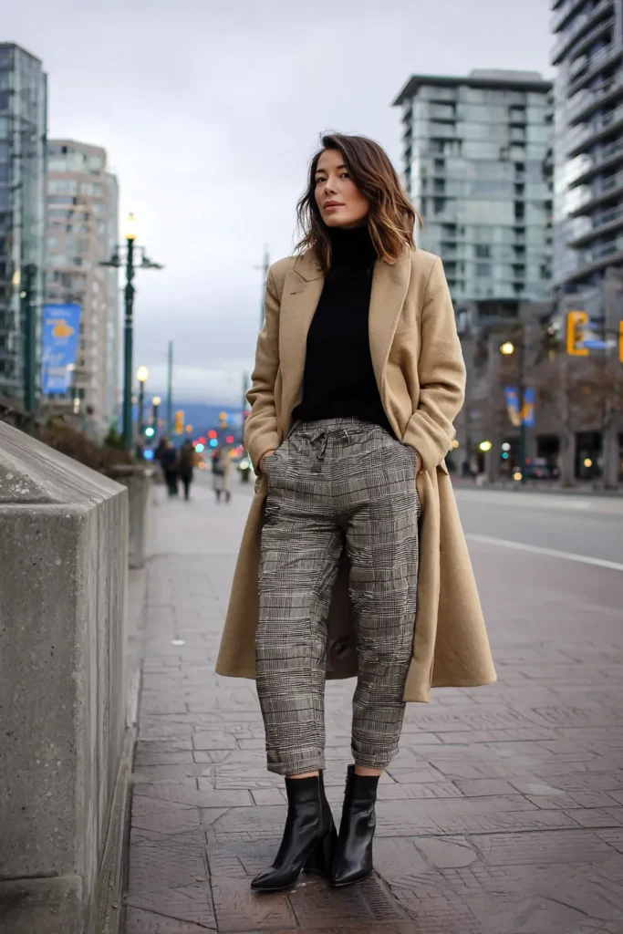 This look brings together a long camel coat and a sleek black turtleneck for a mix that feels timeless and sophisticated. The checked trousers add a subtle pattern that keeps things interesting while the cropped length shows off the sharp black ankle boots. The whole palette leans neutral and polished and the relaxed fit of the trousers balances beautifully with the clean lines of the coat. It feels modern city ready and effortlessly stylish.