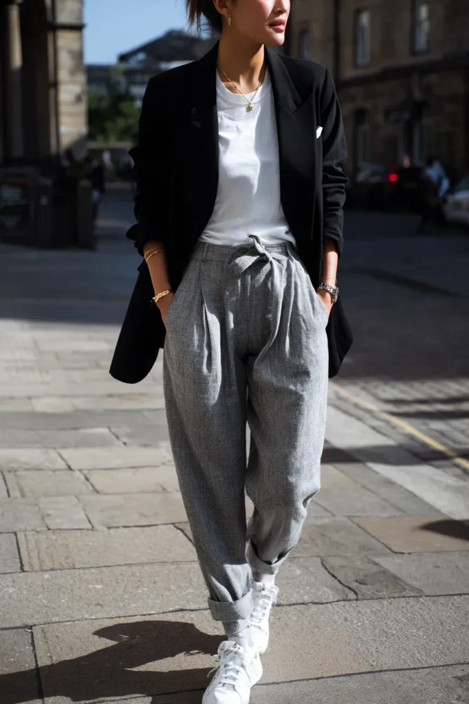 This look blends a crisp white tee with a sleek black blazer that instantly adds structure. The soft gray paperbag trousers bring in a relaxed shape and the tie waist makes the outfit feel effortless. White sneakers keep the whole look fresh and modern which gives the outfit an easy balance of polished and laid back. The gold jewelry adds a little shine without taking away from the clean vibe.