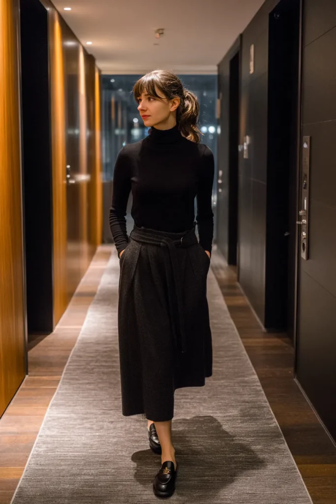 This outfit brings together a fitted black turtleneck and a flowy charcoal midi skirt that creates a soft and refined shape. The turtleneck sits close to the body which balances so nicely with the wide pleats of the skirt. A subtle belt adds structure at the waist and the glossy black loafers finish the look with a polished shine. The overall vibe feels calm and confident which makes it such a lovely take on business casual.