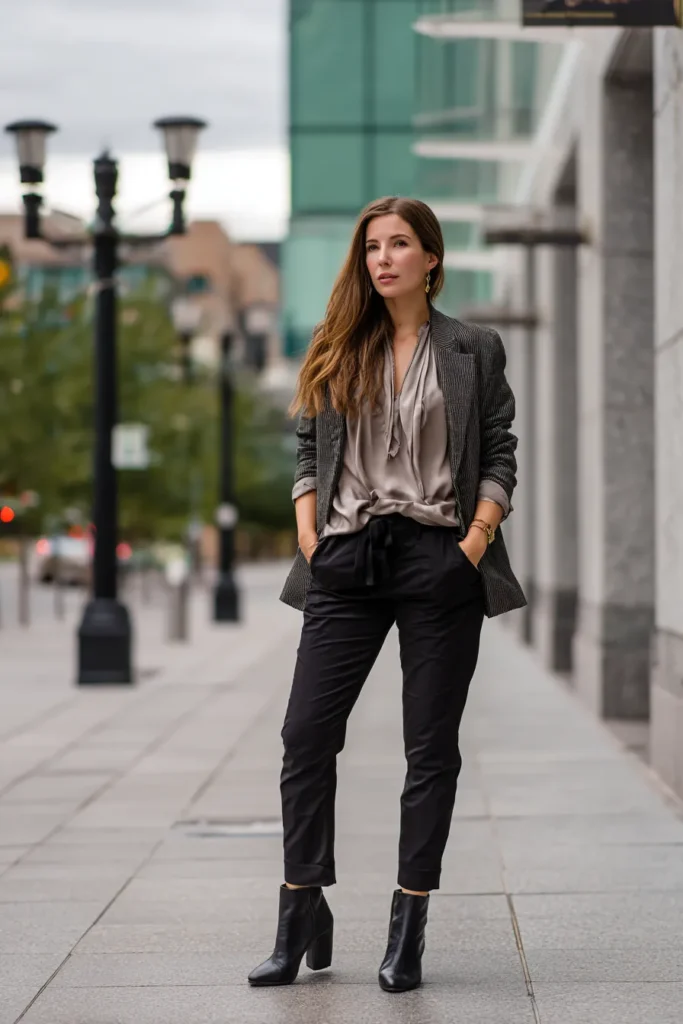 This outfit mixes a silky taupe blouse with a textured tweed blazer that adds instant structure. The blouse drapes so beautifully and the knotted detail gives it a relaxed feel that still looks polished. The tailored black trousers create a clean line and the folded hem keeps things modern. Black ankle boots finish the look with height and a sleek touch which ties everything together in such an easy way.