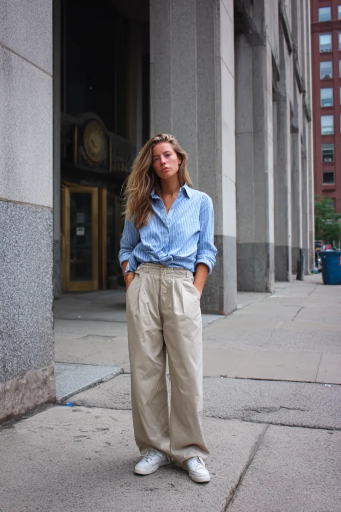 This outfit features a light blue striped button down that feels crisp and classic paired with wide leg beige trousers that move with a soft drape. The shirt is loosely knotted which gives the look a carefree touch while still keeping it office friendly. The trousers sit high at the waist and create a long clean line and the white sneakers add an easy finish that keeps everything grounded and wearable. The whole outfit has that effortless city feel that works so well for business casual days.