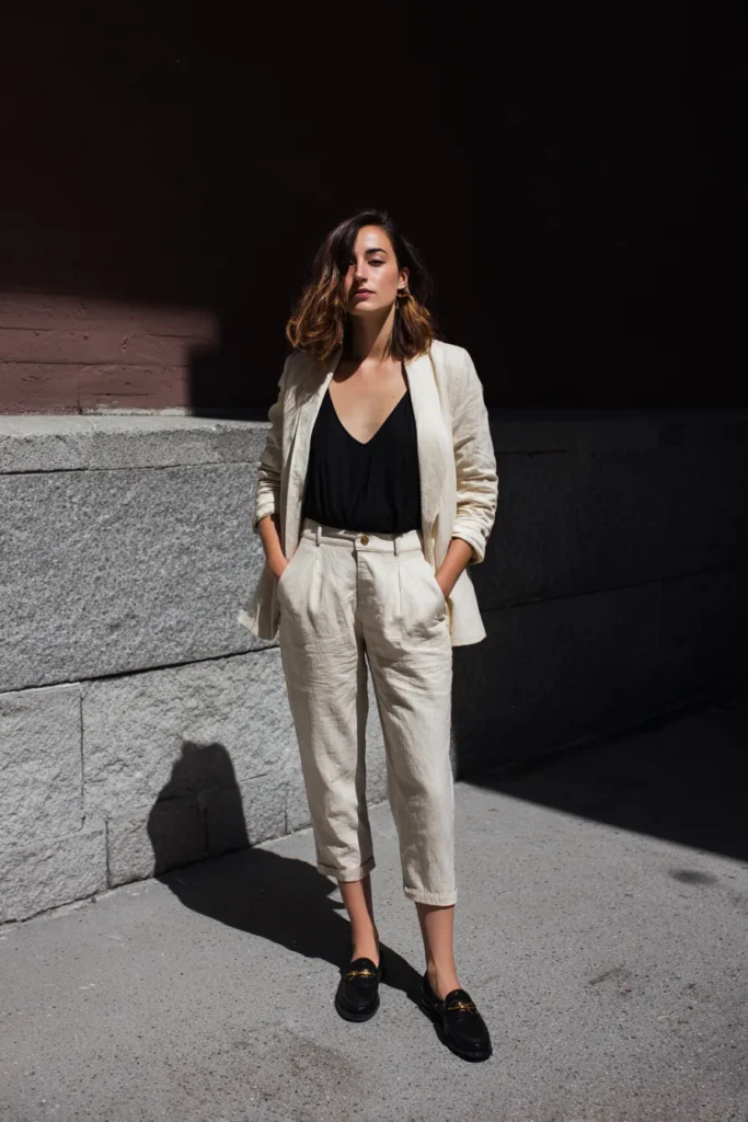 This outfit pairs a cream linen blazer with matching high waist trousers that create a clean and airy silhouette. The soft texture of the linen gives the set a relaxed feel while still looking polished enough for the office. A black V neck top adds contrast and brings a little depth to the look. The black loafers with gold detail finish everything with a sleek touch that keeps the outfit grounded and stylish.