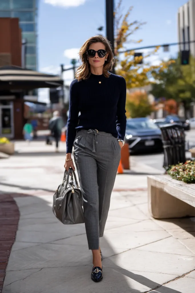 This outfit brings together a fitted navy knit sweater and a pair of tailored gray trousers that feel polished without losing comfort. The trousers have a soft tapered shape with a tie waist that adds a relaxed detail while still looking sharp. Navy loafers keep the look cohesive and the structured gray bag ties the whole palette together. The dark sunglasses and simple gold jewelry add a little chic energy that makes the outfit feel city ready in the best way.