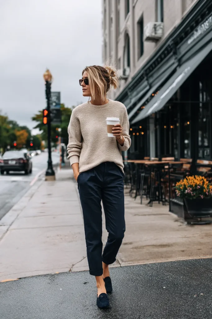This outfit pairs a soft beige knit sweater with relaxed navy trousers that create the perfect mix of cozy and polished. The sweater has a simple textured look that feels warm without being bulky and the trousers add structure with their tapered shape and rolled hem. Navy loafers keep the palette cohesive and the sunglasses bring in a cool effortless touch. The whole look feels casual yet totally work appropriate which makes it great for mornings when you want something simple and reliable.