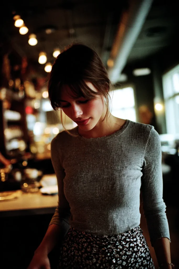 This outfit pairs a fitted ribbed gray top with a flowy black floral skirt that brings in a sweet touch of pattern. The top feels simple and polished with its clean neckline and slim fit while the skirt adds movement and a softer vibe. The mix of textures makes the outfit feel relaxed yet intentional and the muted colors keep everything work friendly.