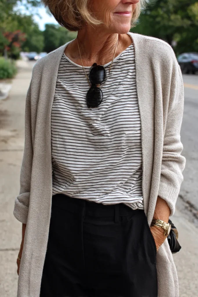 This look brings together a soft neutral cardigan layered over a simple striped tee that feels relaxed and timeless. The black trousers add a refined contrast and create a clean base that balances the easy top half. Gold accessories, including a chunky watch and a delicate necklace, bring in a little shine while the sunglasses tucked into the neckline add an effortless touch. The whole vibe feels unfussy comfortable and still polished enough for a day out or a casual meeting.