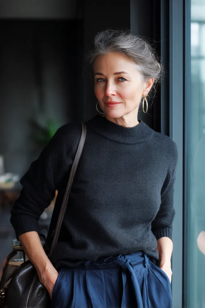 This look pairs a fitted charcoal knit sweater with loose navy trousers that tie softly at the waist. The sweater has a clean and minimal shape that brings a polished feel to the outfit while the lightweight trousers add movement and an easy drape. Gold hoop earrings lift the whole look with a bit of shine and the leather shoulder bag adds a practical touch. The mix of deep tones keeps everything sleek and modern without feeling heavy.