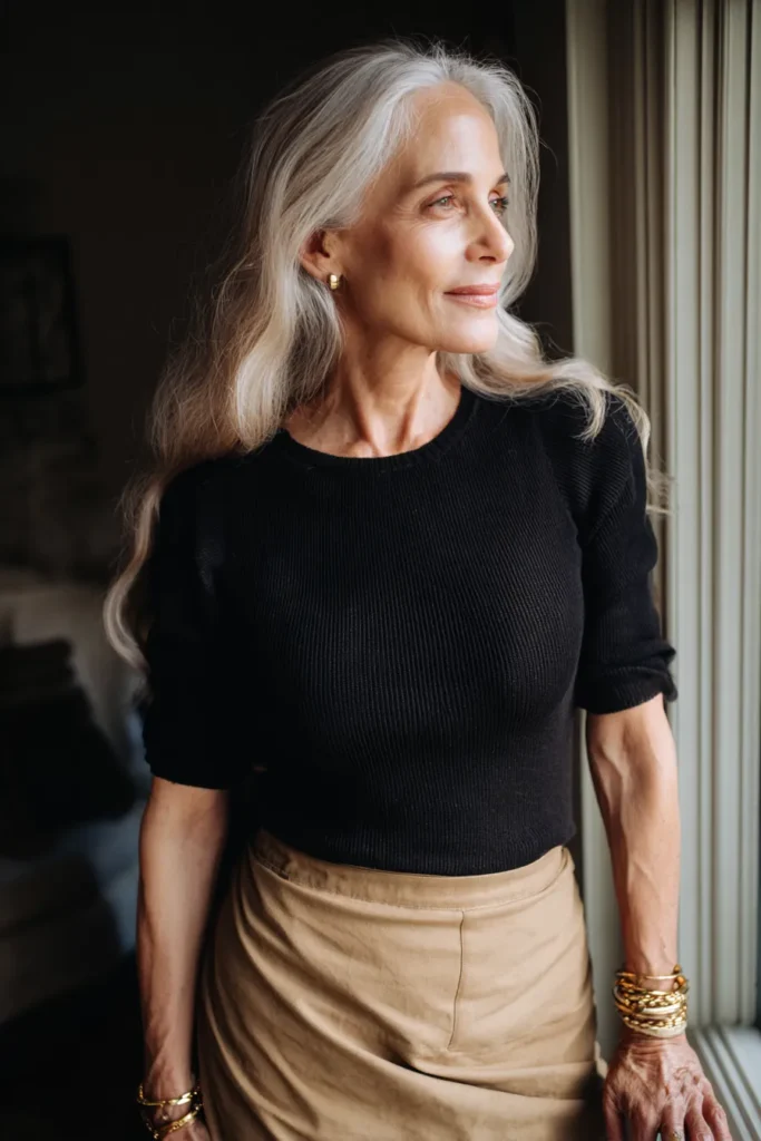 This outfit pairs a fitted black knit top with a smooth camel skirt that creates a beautiful contrast between rich and warm tones. The top has a refined, slightly structured texture that feels polished while the skirt brings softness and flow. The gold bracelets and earrings add a touch of shine that lifts the whole look without overwhelming it. The overall vibe is elegant, modern and subtly powerful in a way that feels incredibly timeless.