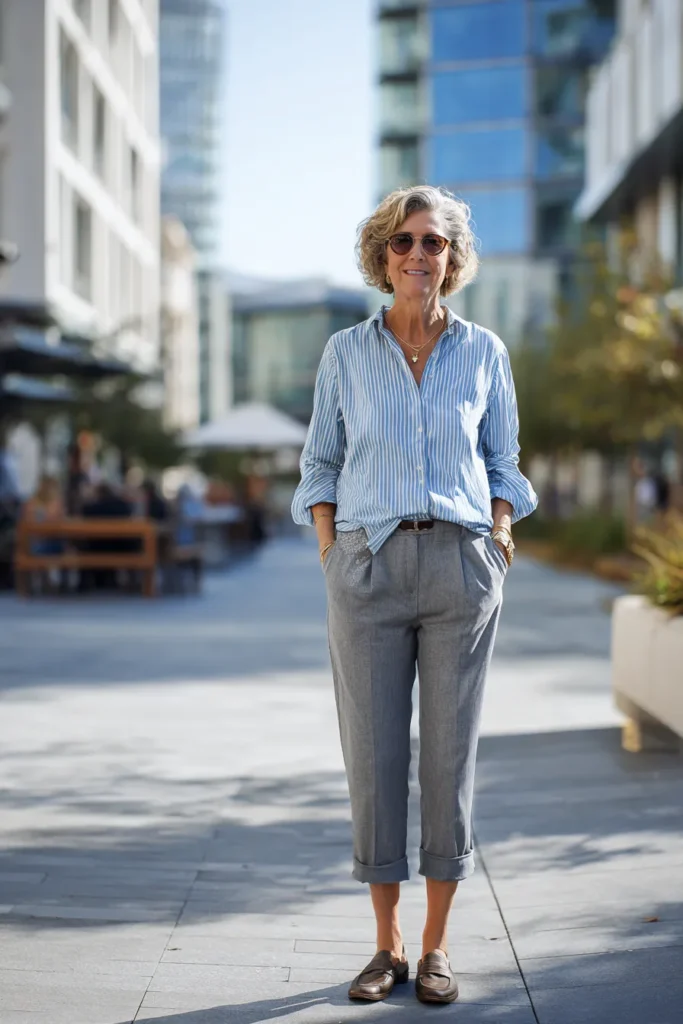 This outfit pairs a relaxed blue and white striped button shirt with tailored cropped gray trousers that feel crisp and polished. The shirt has an easy fit with rolled sleeves that bring a casual charm to the look while the trousers keep everything structured. Brown loafers ground the outfit with a classic touch and the simple gold jewelry adds a soft sparkle. The mix of cool tones with warm accessories creates a beautifully balanced palette that feels fresh and timeless.