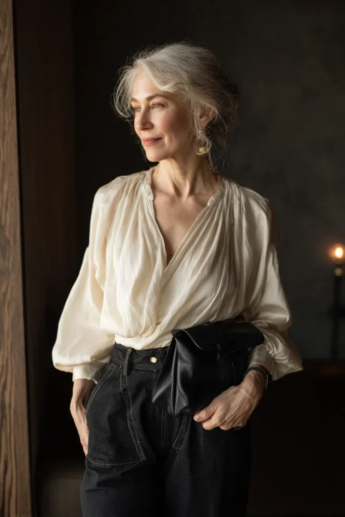 This outfit features a softly draped cream blouse with billowy sleeves that create a romantic and refined silhouette. The fabric has a gentle sheen that catches the light in the prettiest way. Paired with high waisted dark trousers that offer strong structure and visible stitching, the contrast feels modern and stylish. The black foldover clutch adds sleekness and the delicate gold earrings complement the softness of the blouse. The entire look feels graceful, artistic and beautifully composed.