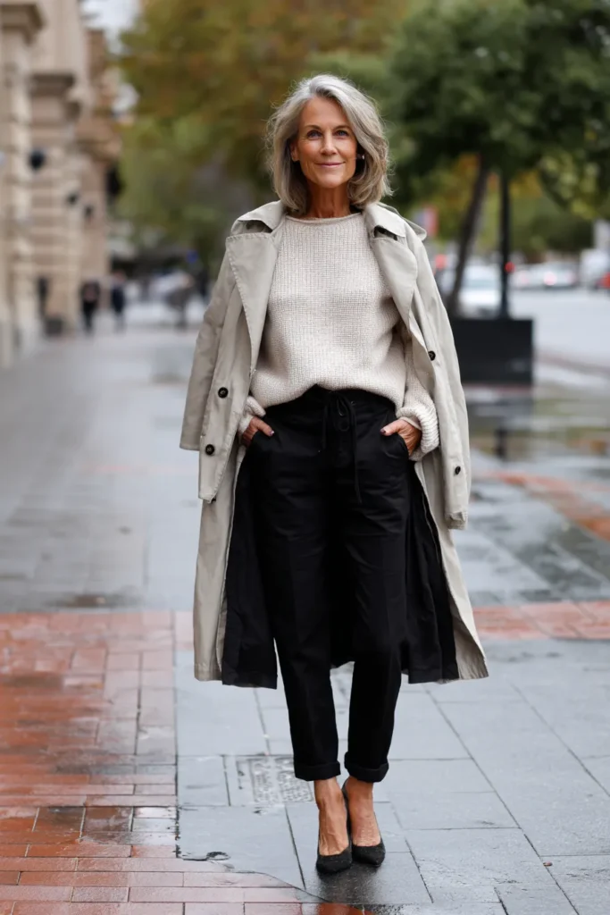 I love how put together this outfit feels without crossing into anything too formal. The trench coat gives me that classic confidence that always feels right and the knit sweater adds softness that makes the whole look approachable. The drawstring pants keep things comfortable which is a lifesaver on days when I want to look polished but still feel relaxed. It is the kind of outfit I reach for when I want something chic and timeless that also feels incredibly wearable.
